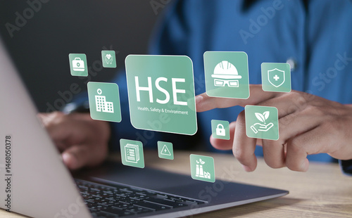 HSE, Health safety environment concept. Standard safe industrial work and industrial. Person using laptop with HSE icons on virtual screen for business and organization.