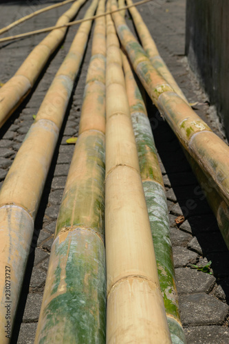 Huge and prepared for constructions yellow bamboo trunks placed on ground