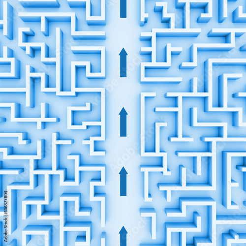 huge blue maze structure, arrows showing shortcut through the middle of the maze garden