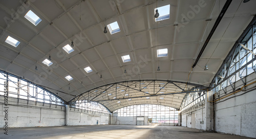 Huge empty industrial warehouse. White interior. Unique architecture. Hemispherical reinforced concrete load bearing roof with windows. Modern building.