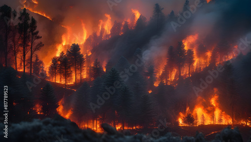 Huge forest fire, environmental disaster, wild fire, mountain fire, AI generated
