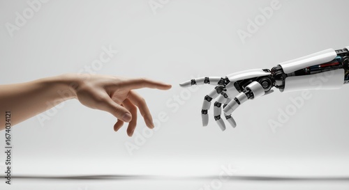 Human and robot hands reach to connect in a technological future of digital transformation and innovative automation