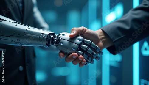 Human and robot handshake in futuristic office. A modern close-up handshake in a production, server room.Confident handshake