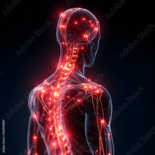 Human body with glowing red pain points on neural pathways illustrating pain or nerve stimulation