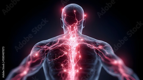 Human body with glowing red pain points on neural pathways illustrating pain or nerve stimulation, set against a dark blue background