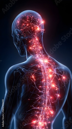 Human body with glowing red pain points on neural pathways illustrating pain or nerve stimulation, set against a dark blue background