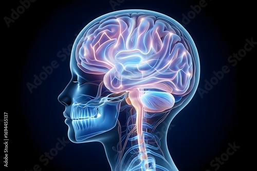 Human brain anatomy with glowing neural pathways and translucent skull illustration image
