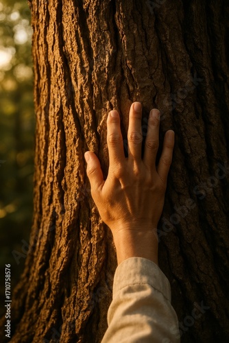 Human connection with nature through gentle tree touch showing environmental consciousness
