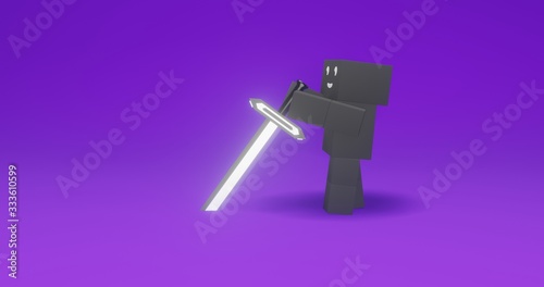 Human cubes want to take a sword pierced ground with shiny effect illustration in purple background. 3D illustration