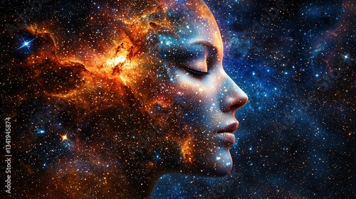 Human face dissolving into a galaxy stars and cosmic dust replacing features symbolizing the infinite mind and universe connection
