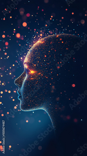 Human face profile made of glowing particles looking up on a dark blue background