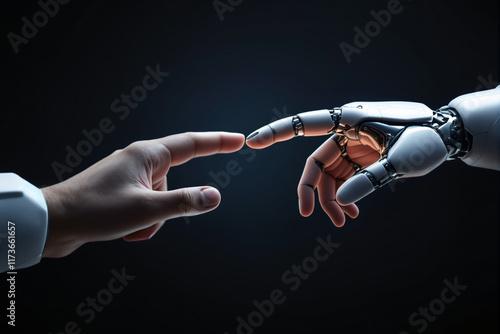 Human hand and robotic hand reaching toward each other in dramatic light on dark background.