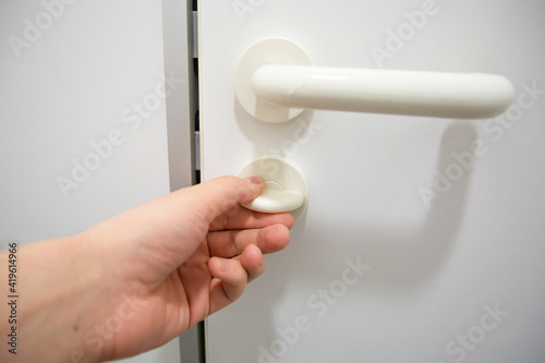 human hand close doorknob of public restroom door to have privacy inside the cabin and be safe from interruptions while relieving