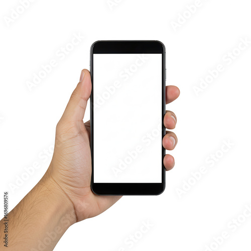 Human hand holding a modern smartphone with a blank screen isolated on transparent background