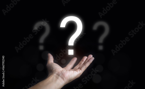 Human hand holding glowing question mark symbol on dark background, concept of doubt, problem solving, decision making, curiosity, brainstorming, idea search, uncertainty challenge.
