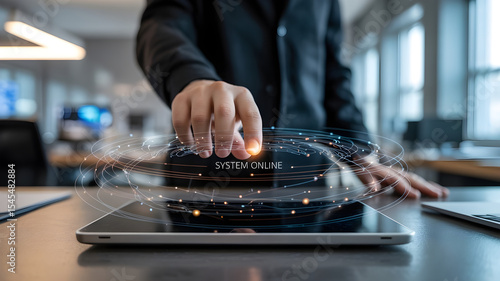 Human hand interacts with futuristic AI interface, surrounded by digital innovation.