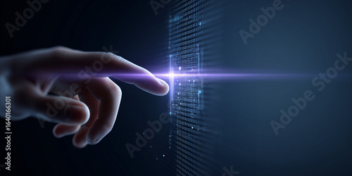 Human hand pressing a digital screen, illuminating with futuristic lines and concepts