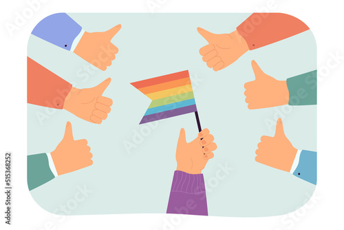 Human hand with rainbow flag surrounded by thumbs up. People approving LGBT community flat vector illustration. Freedom, equality, awareness concept for banner, website design or landing web page