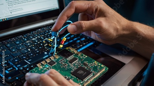 Human hand working with laptop networking
