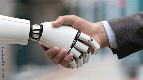 Human handshaking a robotic hand, symbolizing AI-driven technology transforming labor resources, HR relationships, and the future of work
