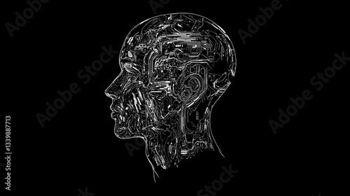 Human head outline merges organic form with a detailed mechanical design reflecting the essence of ai technology. generative ai. Organic Circuitry. Illustration