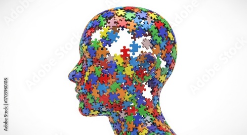 Human Head Silhouette Composed Entirely of Colorful Puzzle Pieces