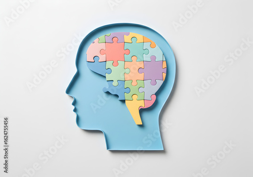 Human head silhouette filled with colorful puzzle pieces. Represents mental health, understanding, intelligence, and cognitive processes.