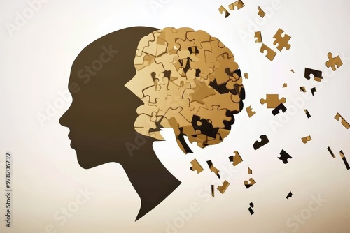 Human head silhouette with puzzle pieces flying out symbolizing memory fragmentation intellectual breakdown and the deconstruction of thought in an abstract conceptual setting