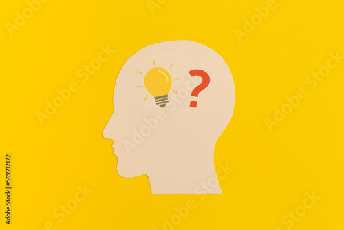 Human head with a question mark and lightbulb on yellow backgroundkground