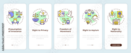 Human law rights onboarding mobile app screen. Walkthrough 5 steps editable graphic instructions with linear concepts. UI, UX, GUI template. Montserrat SemiBold, Regular fonts used