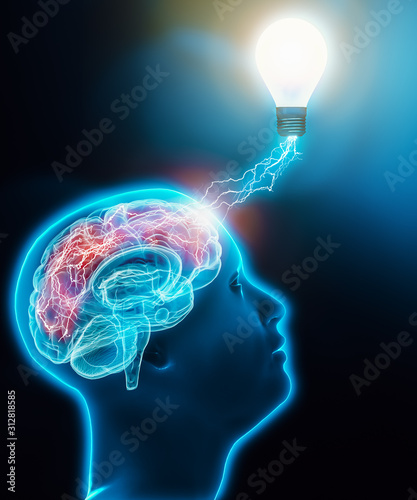 Human male profile head looking up with brain connected to a lightbulb with lightnings. Brain activity, intelligence, imagination, idea, neuroscience, creativity conceptual 3d rendering illustration.