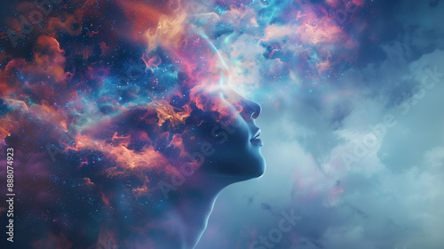 Human mind abstract space science head background. Brain face sky idea universe thought psychology