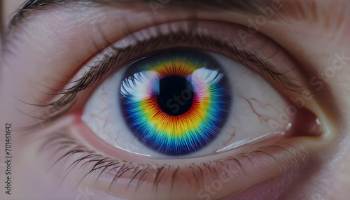 Human multicolored iris of the eye animation concept. Rainbow lines after a flash scatter out of a bright white circle and forming volumetric a human eye iris and pupil.