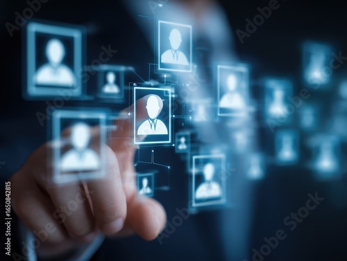 Human resource management technology (HR), Human resource manager touching human resource network structure and checks the CV online to choose the perfect employee for company, Effective recruitment.