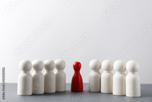 Human resources concept. Red figure among wooden ones on table against light background, closeup. Space for text