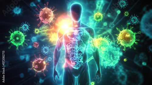 Human silhouette with glowing immune system, surrounded by colorful viruses, illustrating body defense mechanisms and health. vibrant representation of immunity