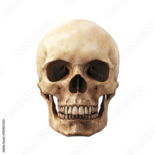Human skull front view on black background anatomical study