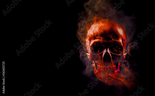 Human skull surrounded red smoke on black background, Generative AI. Harm of smoking, Halloween party or horror background, card or banner.