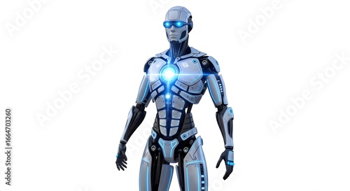 Humanoid android with glowing chest reactor emitting neon light, futuristic sci-fi design, isolated on pure white background.