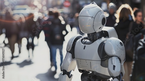 Humanoid Robot: A humanoid robot interacting with people in a busy urban environment, seamlessly blending in.