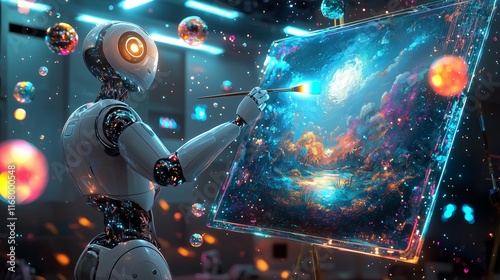 Humanoid robot creating digital artwork on a futuristic canvas, blending natural landscapes with vibrant cosmic themes, symbolizing AI-driven creativity and innovation.