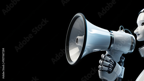 Humanoid Robot with Megaphone for Communication with black background , robot marketing copy space background