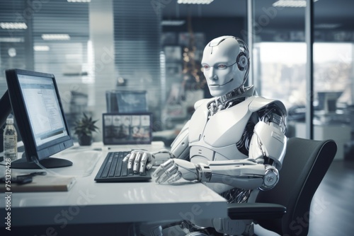 humanoid robot working at computer in office room. Working robot
