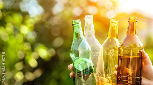 Humans hand shows used recyclable packages materials of bottle glass transparent Many glass bottles separe and prepared for recycling Concept of responsible care and save the world Wid : Generative AI