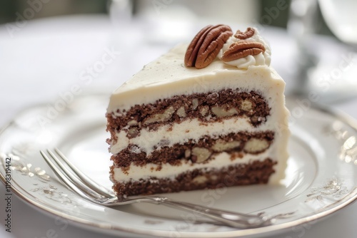 Hummingbird cake slice with pecans and cream cheese icing selective focus