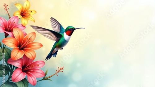 Hummingbird hovering near hibiscus flowers. Vivid colors and soft background.