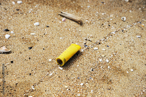 Hunting cartridge on the sand. Garbage on the beach. Dirty sea shore. Environmental pollution. Save the Planet. Ecological problem. Nature theme.
