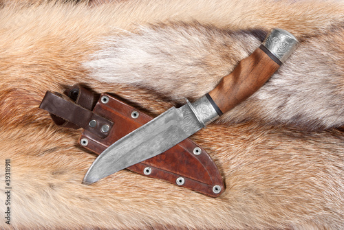 Hunting knife from braided hurlled on background of the fur