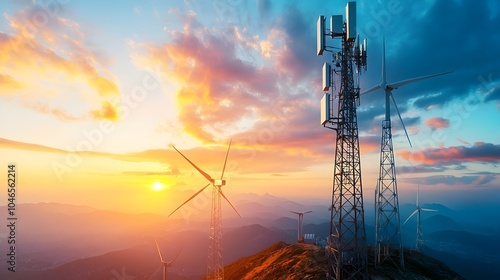 Hybrid cell tower integrated with wind turbines captured at sunrise generating renewable electricity for the power grid Innovative infrastructure solution combining technology and green energy
