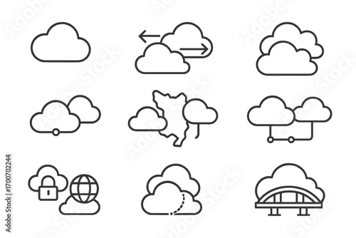 Hybrid Cloud Icons. Line style icons of hybrid and multi-cloud: cloud mix icon, hybrid system arrows, multiple cloud shapes,